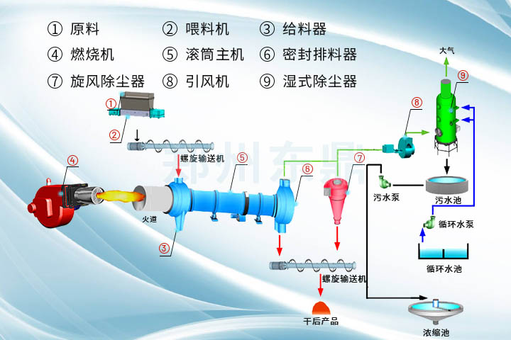 1、采用順流烘干工藝,熱能利用率搞,滾筒外保溫措施熱效率達到80%以上;