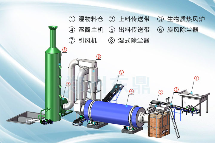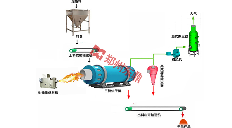 木屑由喂料機輸送至滾筒內(nèi)筒,經(jīng)過導料區(qū)以及料幕區(qū)以及快速中轉(zhuǎn)區(qū)三個干燥區(qū)域過程中,充分與加熱空氣進行熱交換,在導料區(qū)和料幕區(qū),鄭州東鼎采用新型揚料裝置和螺旋帶輸送結(jié)構(gòu),大幅提高了濕物料的受熱效率,加快干燥;至此木屑進入滾筒烘干機中層烘干區(qū)域,該區(qū)域設置的全是全折彎抄板大角度螺旋帶結(jié)構(gòu),物料在中層滾筒由熱風和螺旋帶共同作用下快速向滾筒前段移動,同時吸收內(nèi)層滾筒散發(fā)的熱量和中層滾筒熱風的熱量進行熱交換,物料在此達到干燥狀態(tài),物料進入外層筒內(nèi)。物料在外層滾筒呈矩形多回路方式行進,達到干燥效果的物料在熱風作用下快速排出滾筒,沒有達到干燥效果的濕物料因自重而不能快速行進,物料在此矩形抄板內(nèi)進行充分干燥,完成整個烘干過程。
