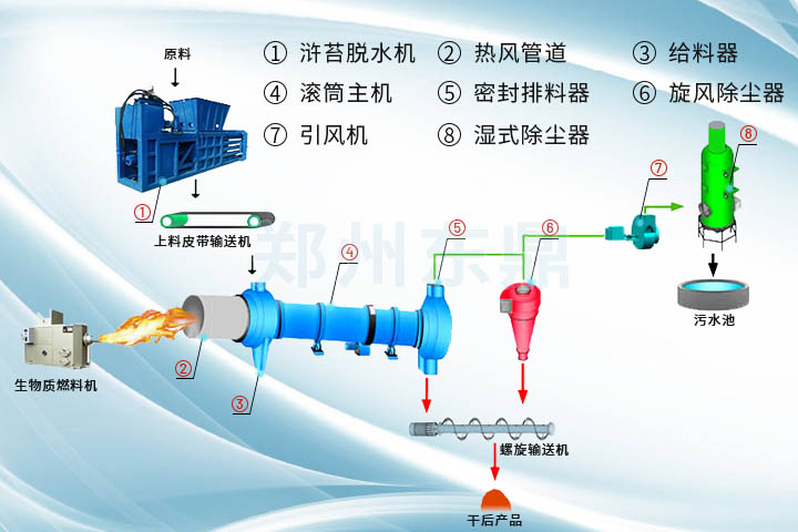 滸苔烘干機(jī)生產(chǎn)線主要由壓榨脫水設(shè)備、熱源、上料機(jī)、進(jìn)料機(jī)、干燥主機(jī) 、出料機(jī)、引風(fēng)機(jī)、卸料器和配電柜、粉碎系統(tǒng)、打包系統(tǒng)等部件構(gòu)成;具體工藝如下水分含量高達(dá)80%以上的濕滸苔經(jīng)壓榨脫水系統(tǒng)擠壓脫水后水分降到65%左右,然后經(jīng)螺旋上料機(jī)進(jìn)入干燥系統(tǒng),在干燥滾筒內(nèi)均布的抄板翻動(dòng)下,進(jìn)行均勻分散與熱空氣充分接觸,加快了烘干傳熱、傳質(zhì)。在烘干過程中,物料在帶有傾斜度的抄板和熱介質(zhì)的作用下,至烘干機(jī)星形卸料閥排出烘干成品。