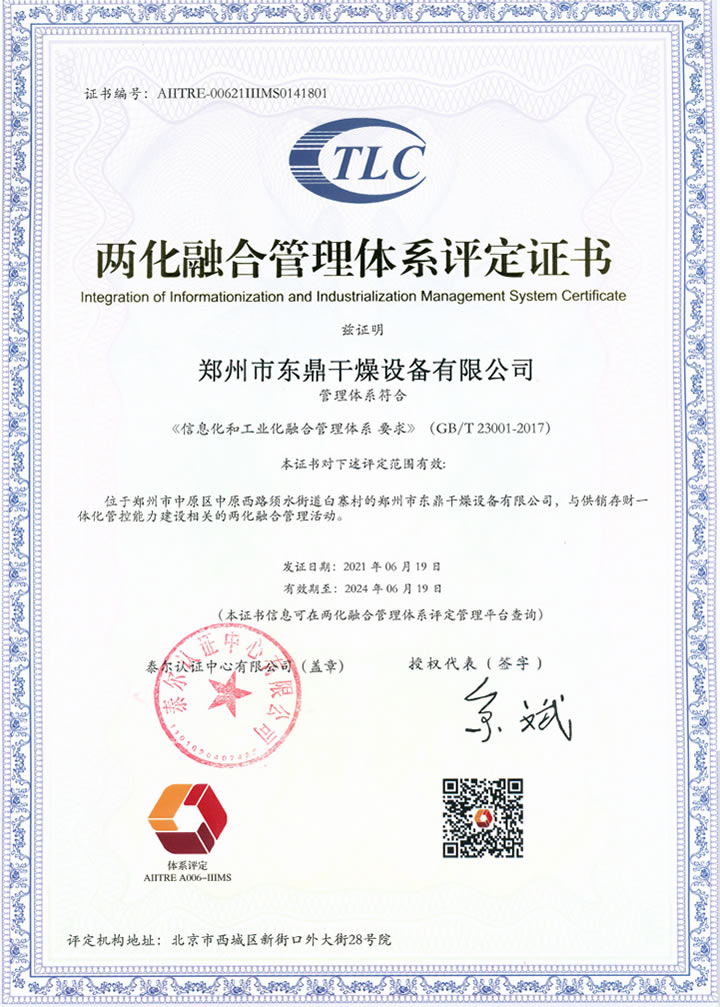 精彩六月喜訊傳,熱烈祝賀鄭州市東鼎干燥設(shè)備有限公司于2021年6月19日順利通過兩化融合管理體系評(píng)定并取得證書,這標(biāo)志著我司在推進(jìn)工業(yè)化和信息化融合方面取得了新的突破。兩化融合是信息化和工業(yè)化的高層次的深度結(jié)合,是以信息化帶動(dòng)工業(yè)化、以工業(yè)化促進(jìn)信息化,走新型工業(yè)化道路,兩化融合管理體系是企業(yè)系統(tǒng)地建立、實(shí)施、保持和改進(jìn)兩化融合過程管理機(jī)制的通用方法,通過兩化融合管理體系認(rèn)證,為我公司可持續(xù)發(fā)展提供了科學(xué)、有效的指導(dǎo),促進(jìn)了戰(zhàn)略目標(biāo)與信息化工作的有機(jī)結(jié)合,公司將以兩化融合管理體系為契機(jī),通過信息化系統(tǒng)建設(shè),全面提升企業(yè)管理水平和管理效益,為公司可持續(xù)發(fā)展戰(zhàn)略提供強(qiáng)勁動(dòng)力!